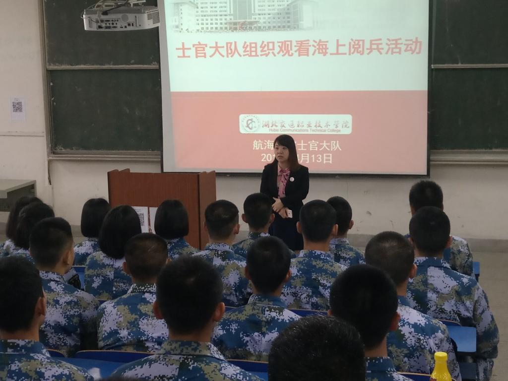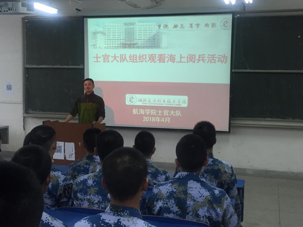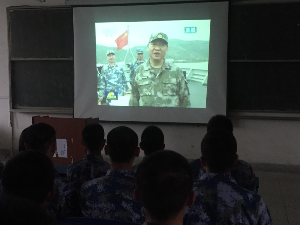 2018年4月13日下午2:00,航海学院士官大队组织全体士官生在综合楼五楼阶梯教室观看“南海海域海上阅兵,聆听习主席重要讲话”活动,观看中会场时时爆发出阵阵掌声,在全体士官生中引起强烈反响。观看结束后组织士官生进行讨论,在讨论中士官生纷纷表示,这次视察检阅充分体现了习主席对海军部队的关心关注,习主席的讲话给了我们极大鼓舞与鞭策。士官生们纷纷表态:我们会更加努力训练,锤炼本领,为做一名合格海军士官时刻准备着!