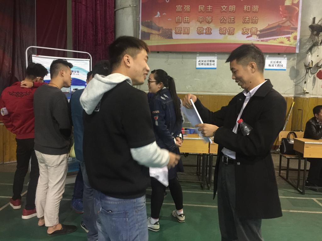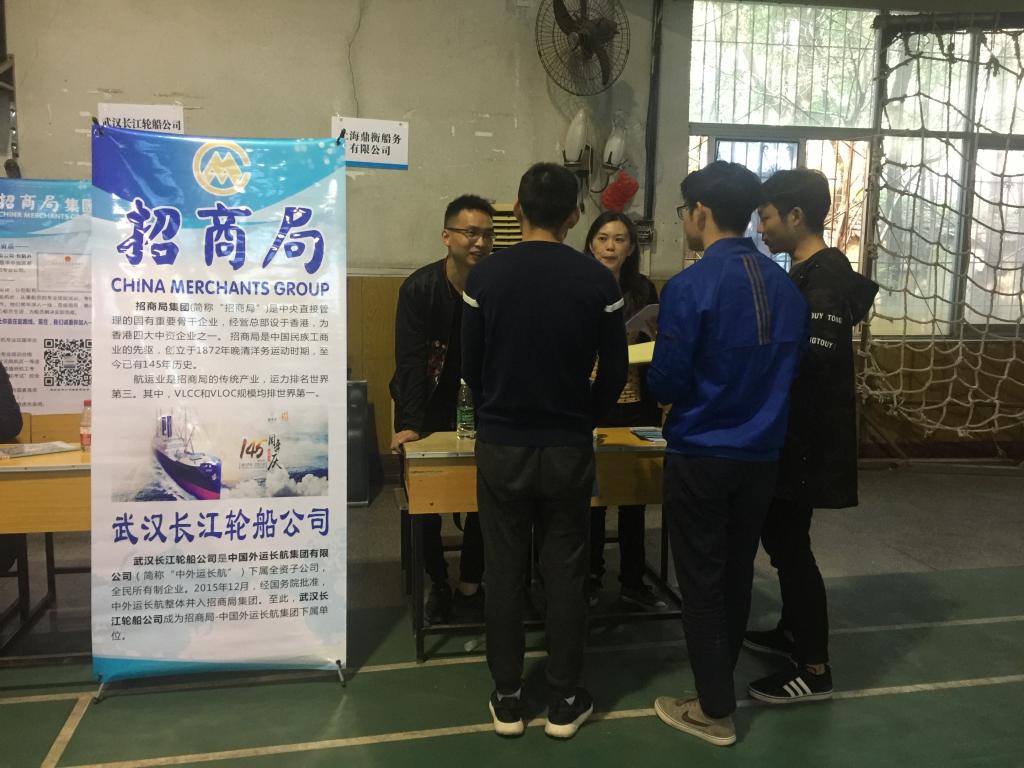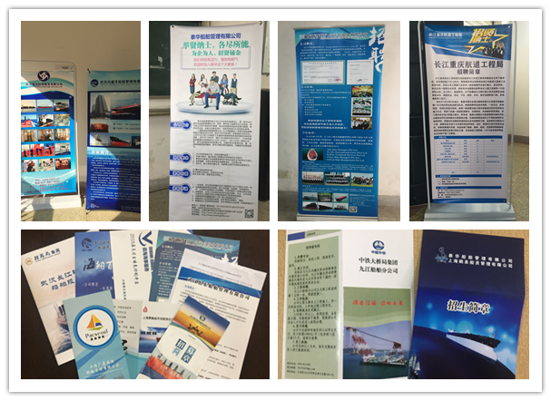 参加招聘的17家业内知名公司——北京鑫裕盛船舶管理有限公司、上海鼎衡船务有限公司、武汉长江轮船公司、长江重庆航道工程局、中铁大桥局九江船舶公司、武汉富洋船舶管理有限公司、武汉怡东船舶管理有限公司、上海远洋对外劳务有限公司、厦门兴诺信船舶管理有限公司、泰华船舶管理有限公司、厦门海隆对外劳务合作有限公司、上海森海海事服务有限公司、武汉兴盛洋船舶管理有限公司、上海广嘉国际船舶管理有限公司、大连国际海事技术服务有限公司、中海海员对外技术服务有限公司、中铁广州工程局港航工程有限公司。各公司通过学校搭建的宣传平台,利用视频、图片、文字、展板、宣传海报等多媒体形式、全方位的向应届毕业生们展现了公司的运营实力、发展方向及远景目标,对学生的就业选择及职业规划提供了参考,指明了方向。